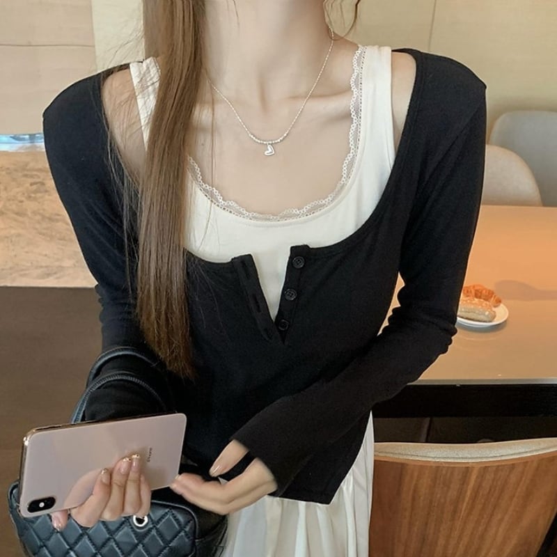 クルーネックトップスはシンプルながらフロントボタンを開けてもOK♪
