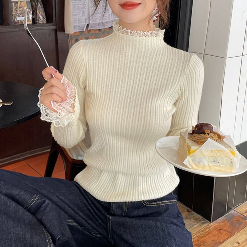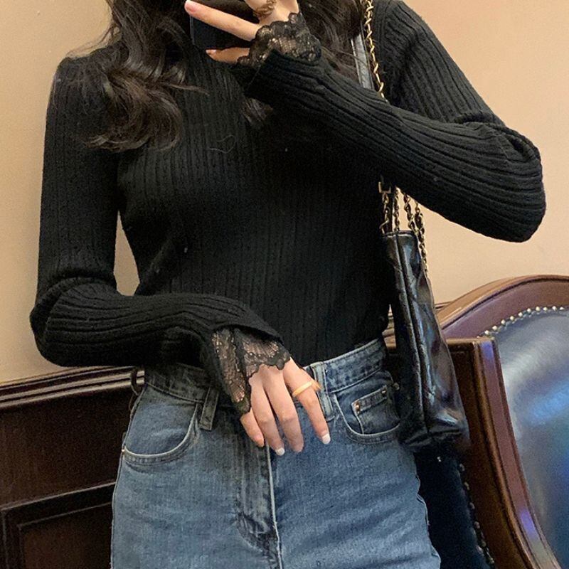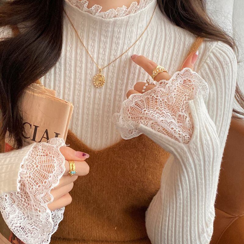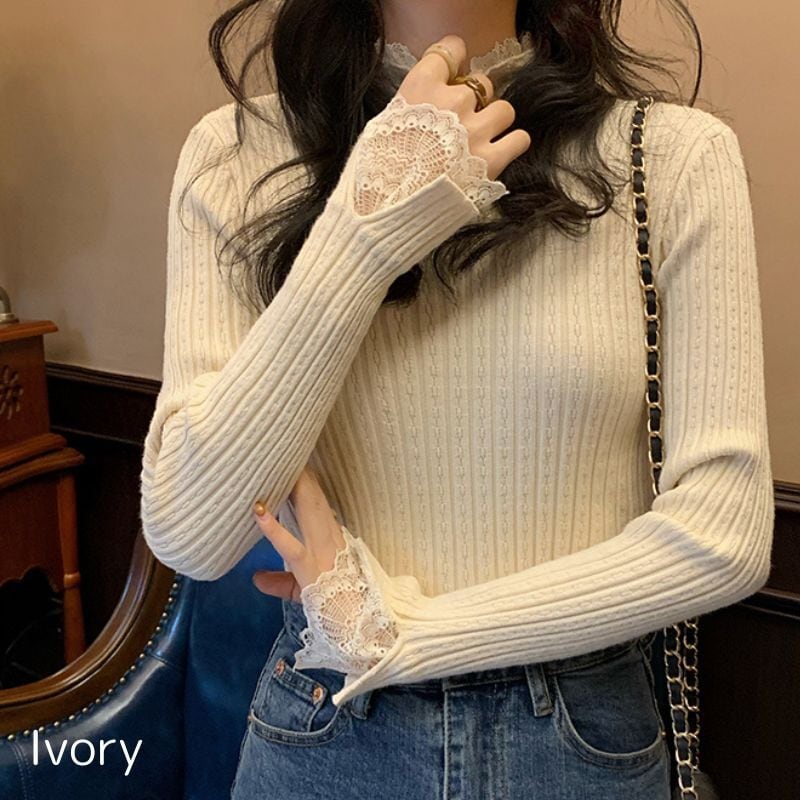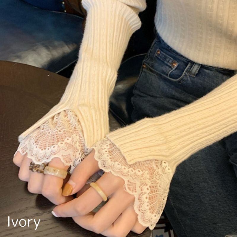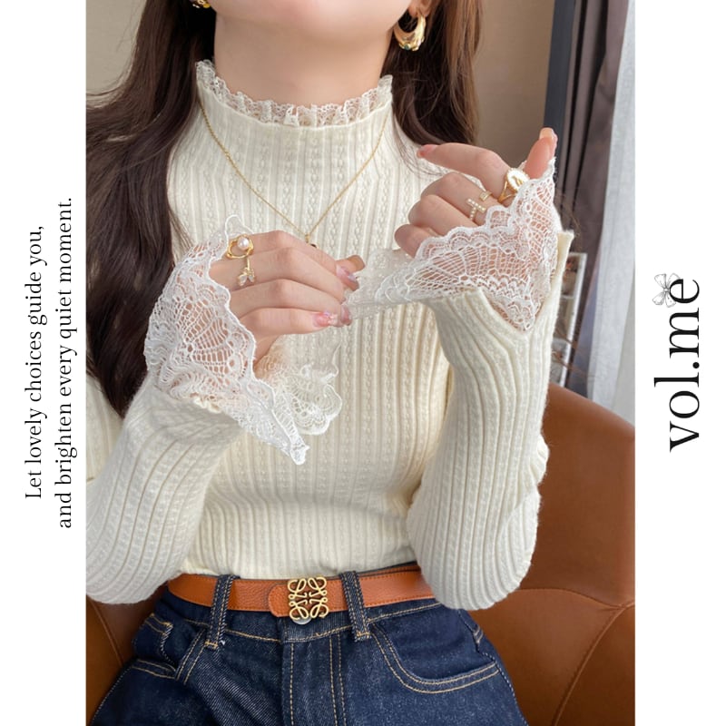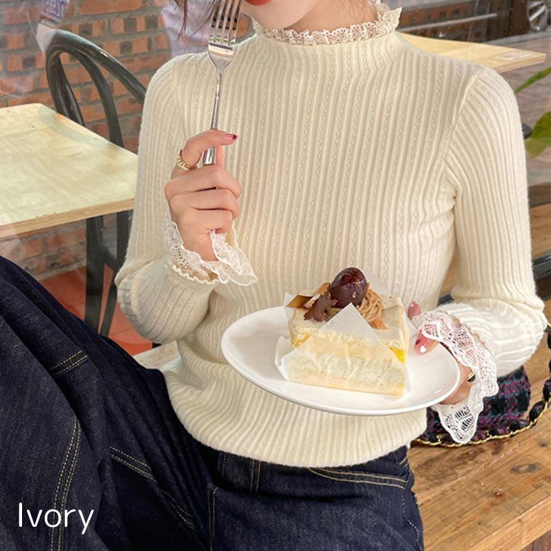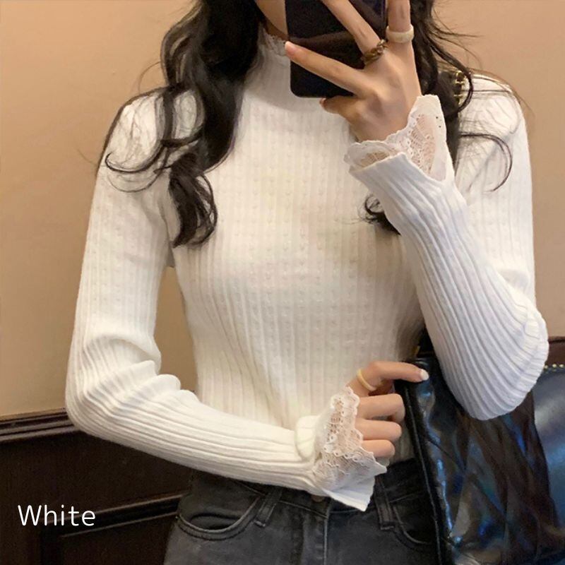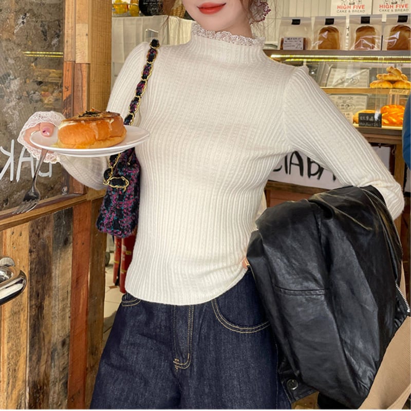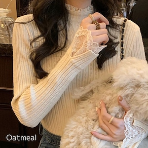 レーススリット袖口ハイネックカットソー♢全4色 12241