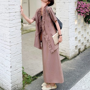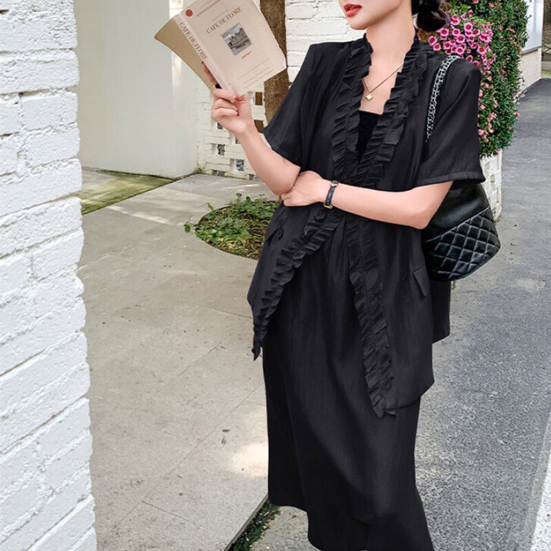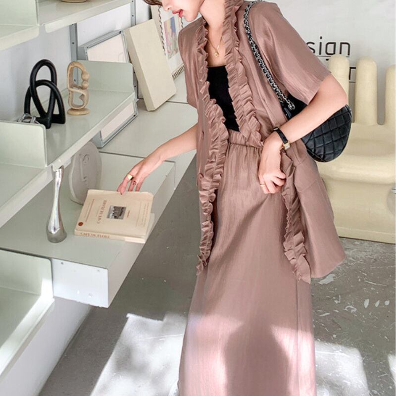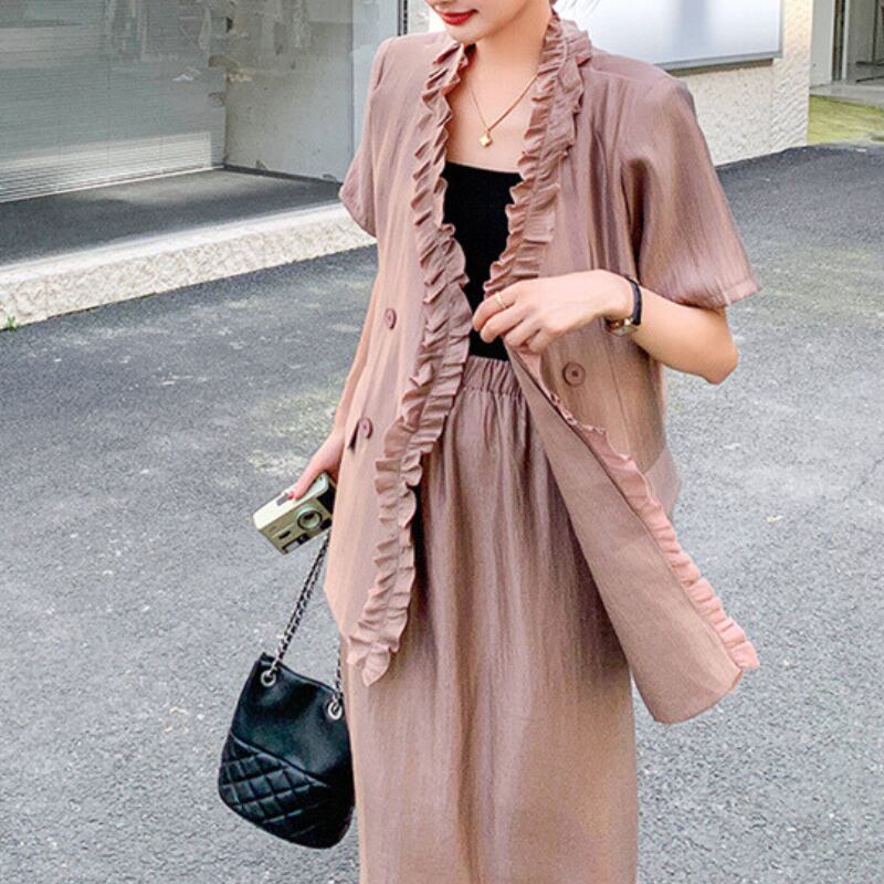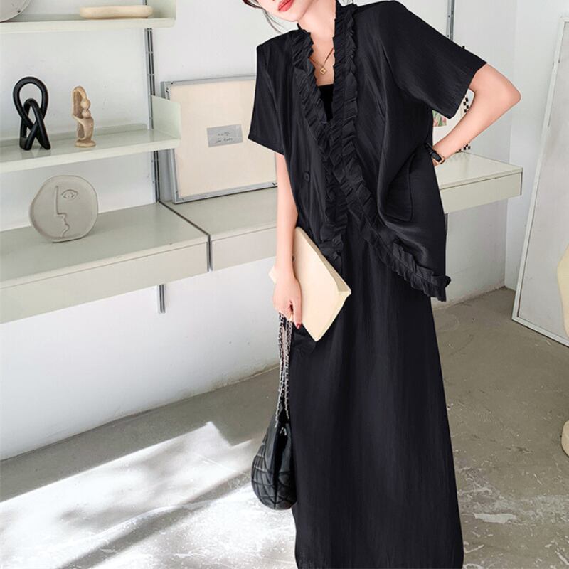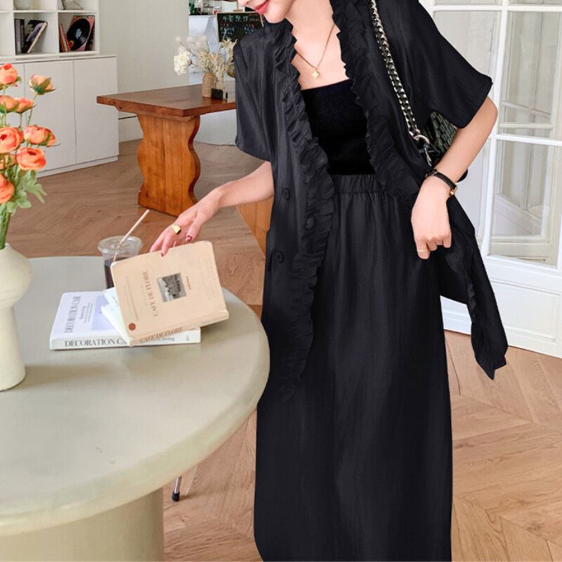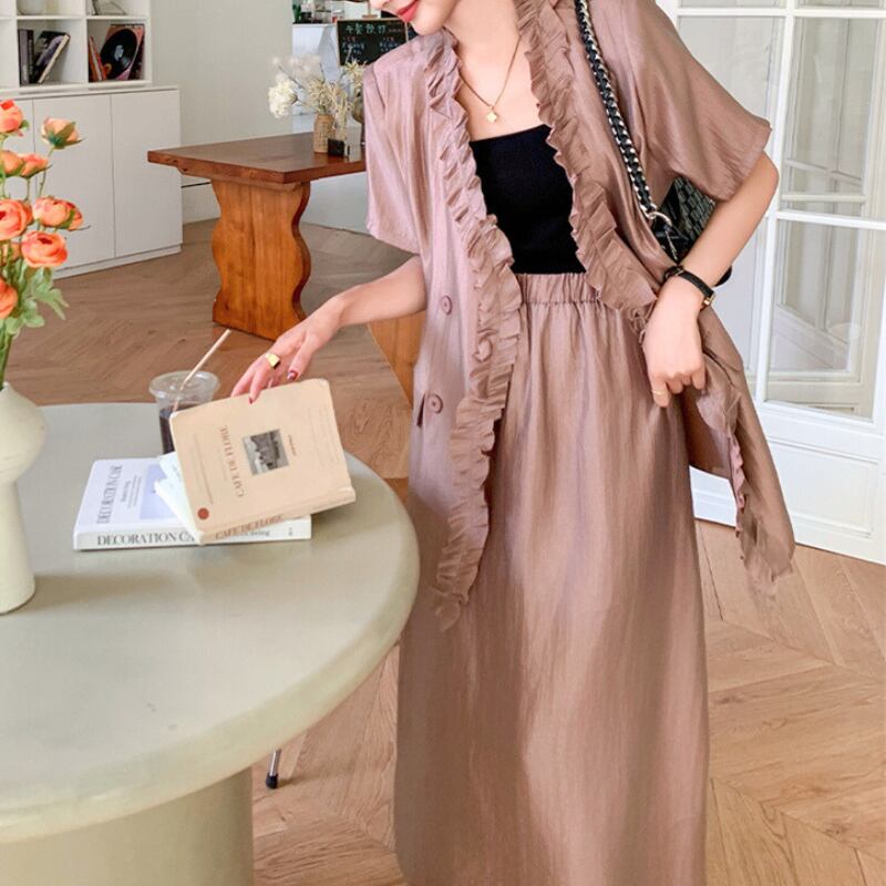 フリルネック半袖ジャケット+ スカートセット♢全2色 11044