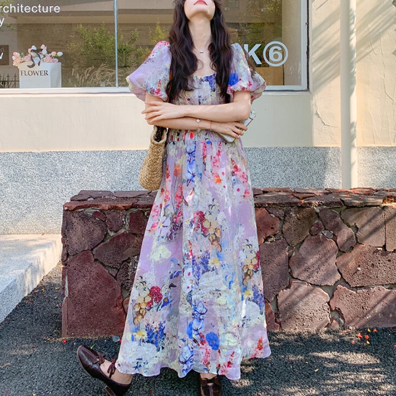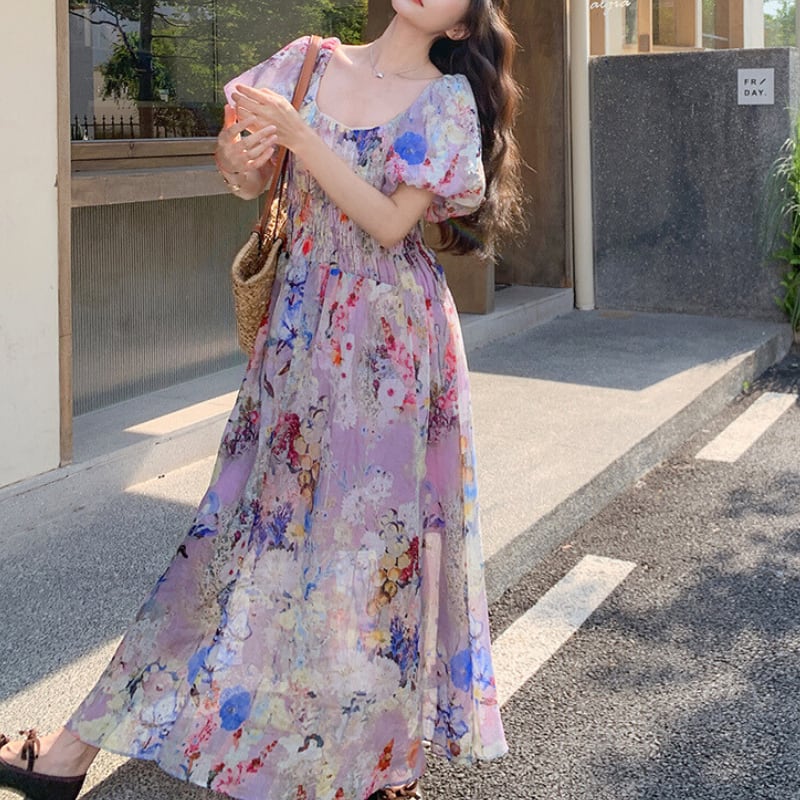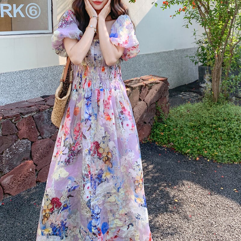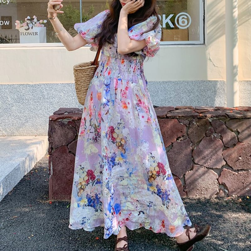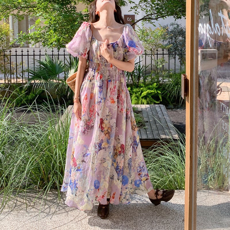 上品な花柄とパフスリーブが魅力のロングワンピース♡