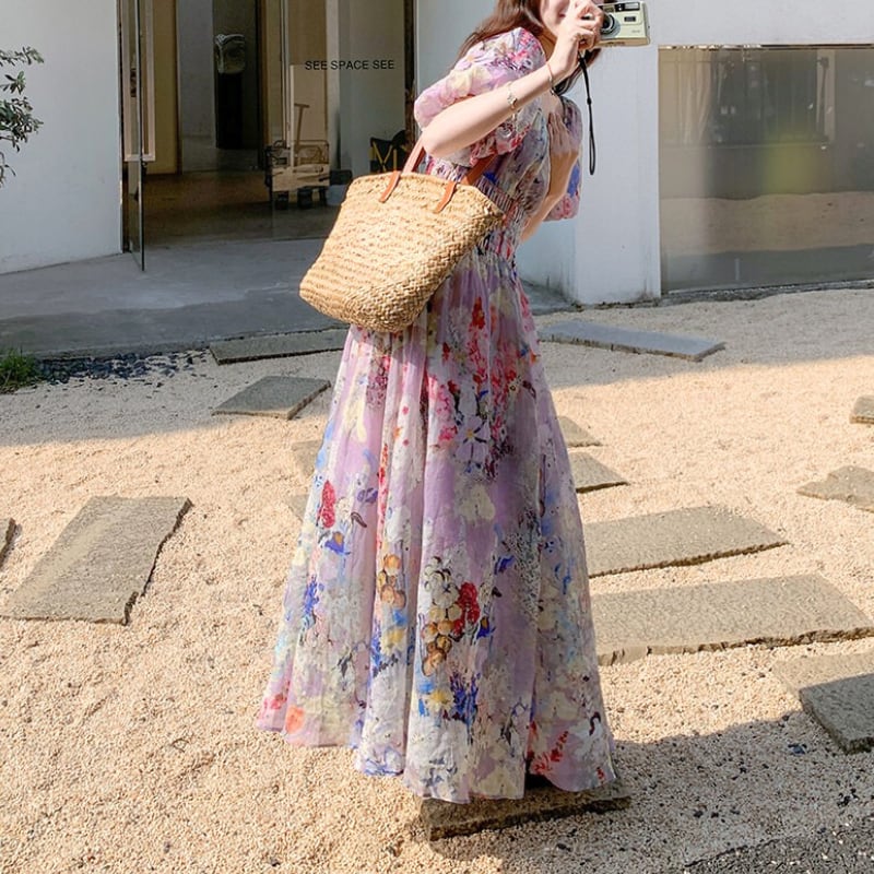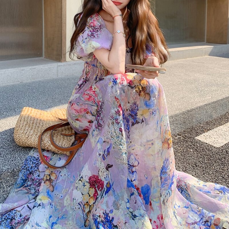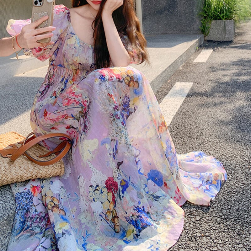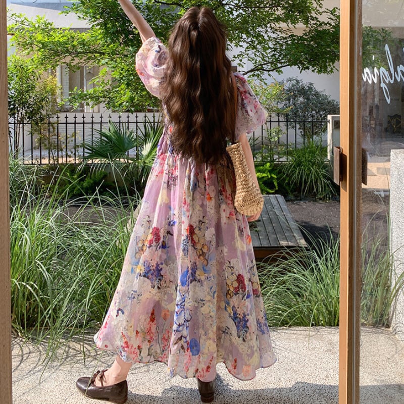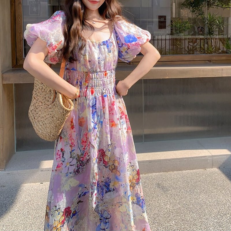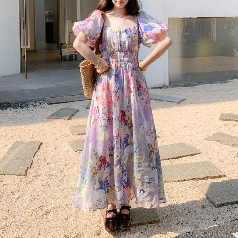 花柄プリントパフスリーブロングワンピース 11120