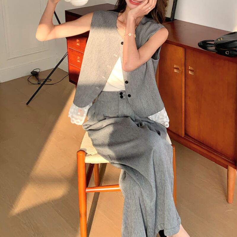 裾レースベスト+ワイドパンツセット 12321