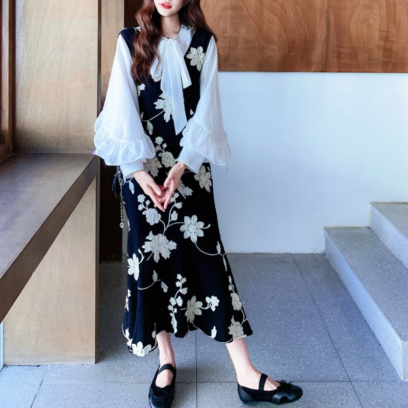 フレアスリーブブラウス+花柄ワンピースセット 12329