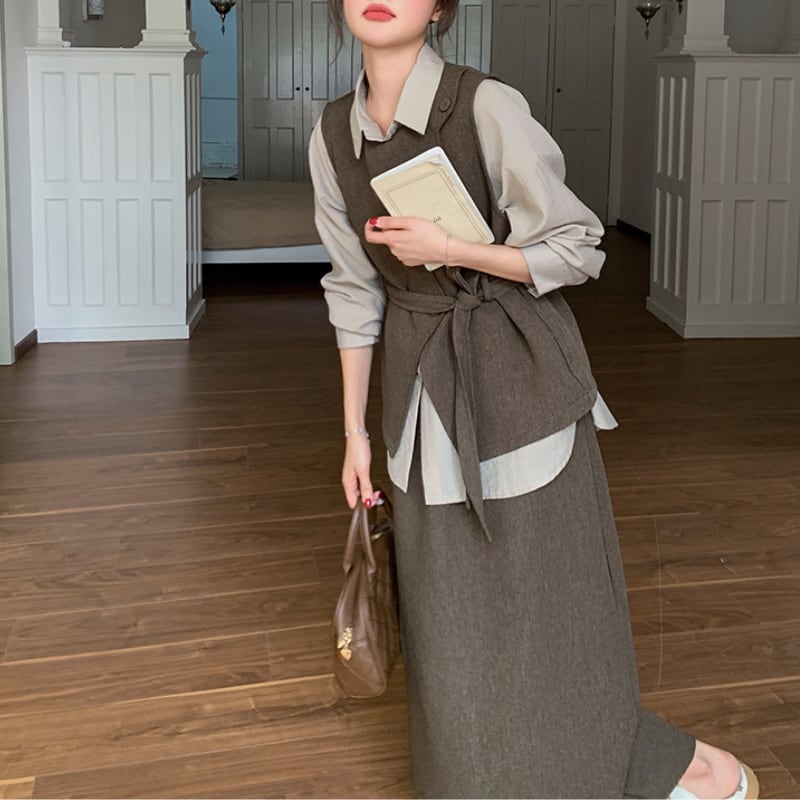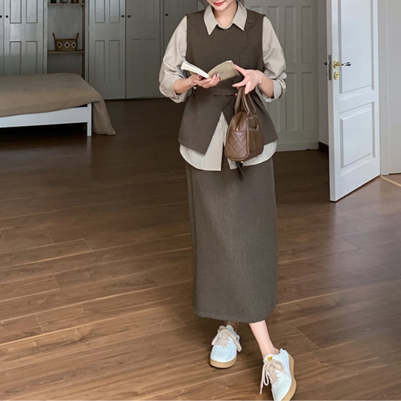 デザインベスト+シャツ+スカート3セットアップ♢全2色 11214