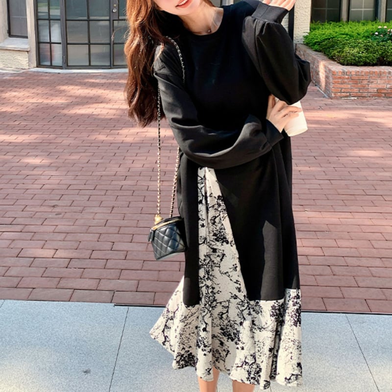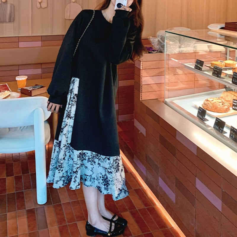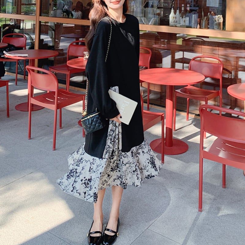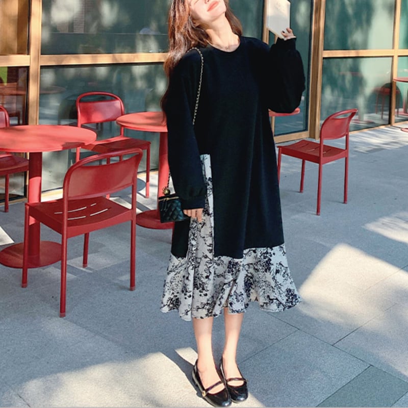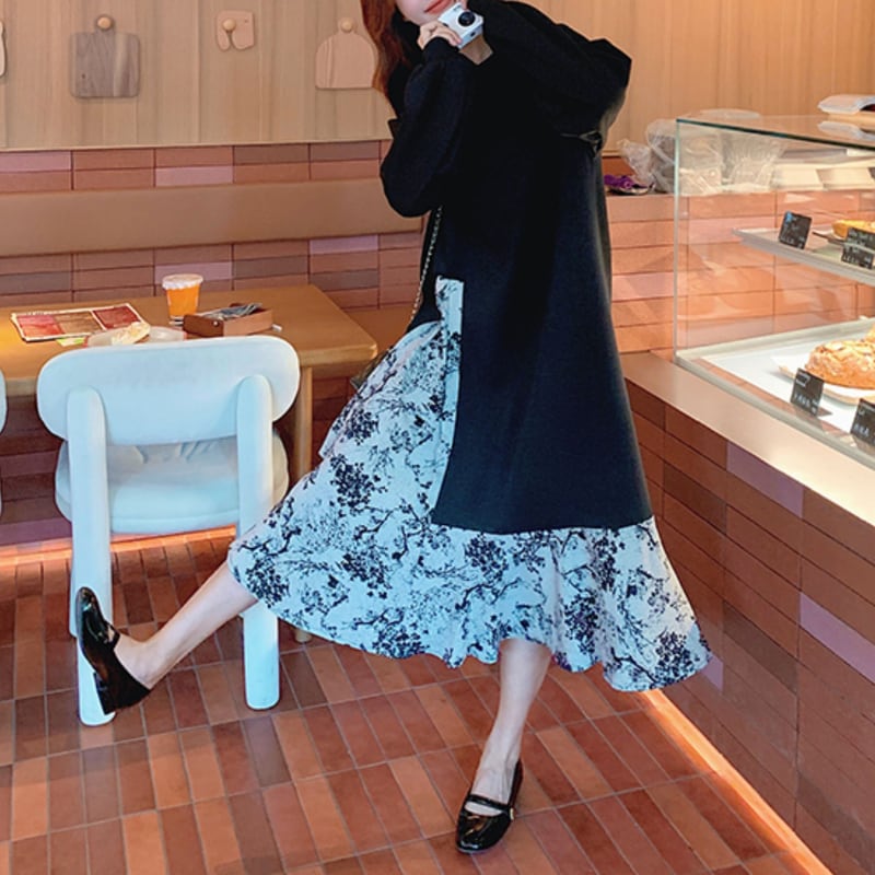 裾の花柄フレアが歩くたびに揺れ、優雅な印象を与え、