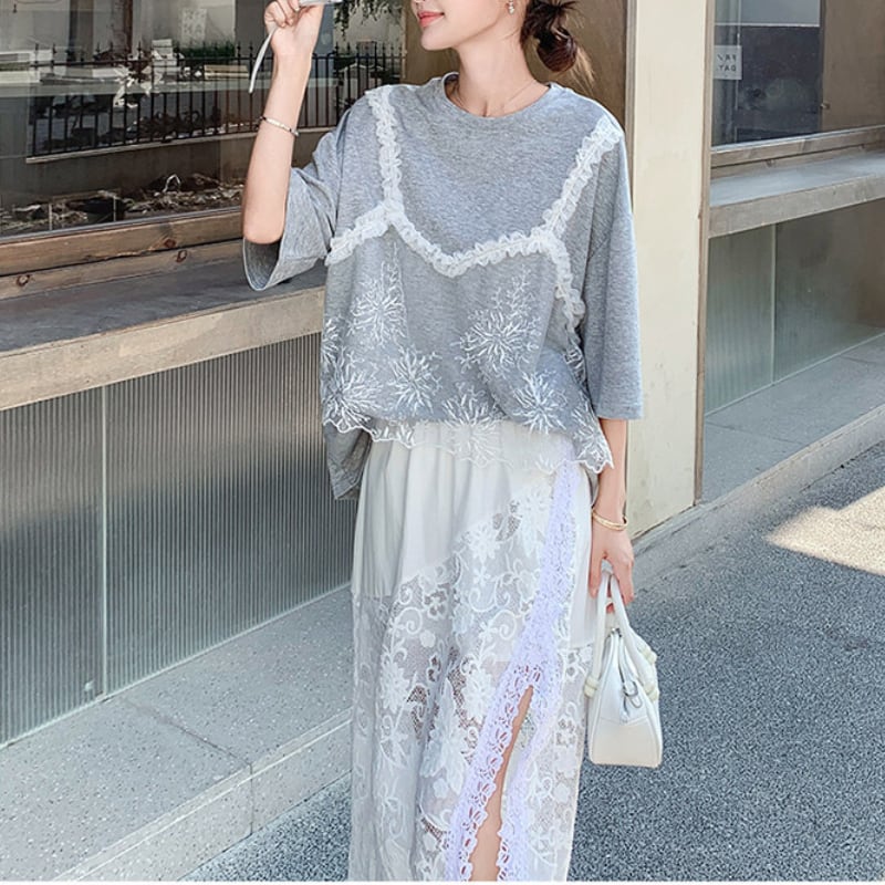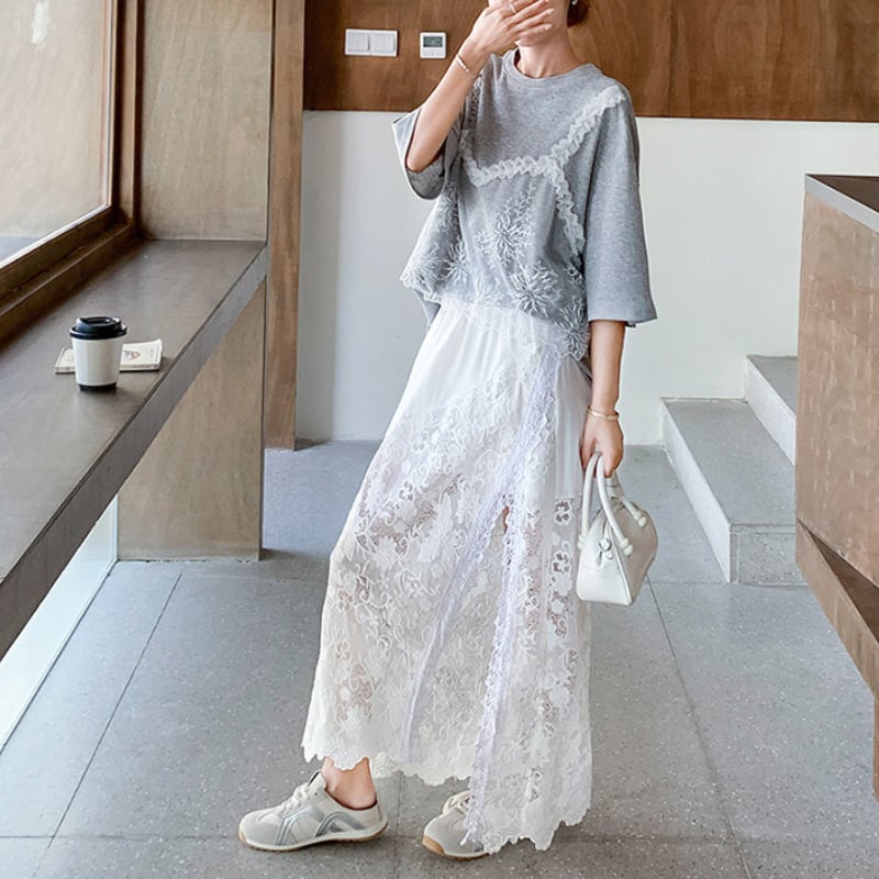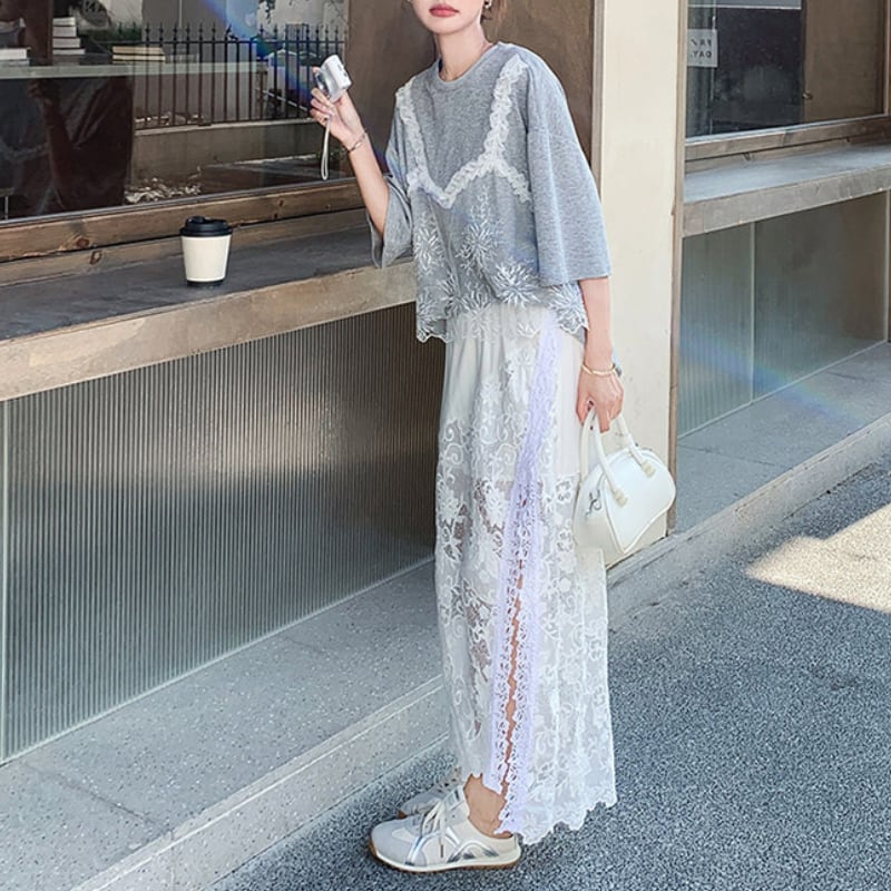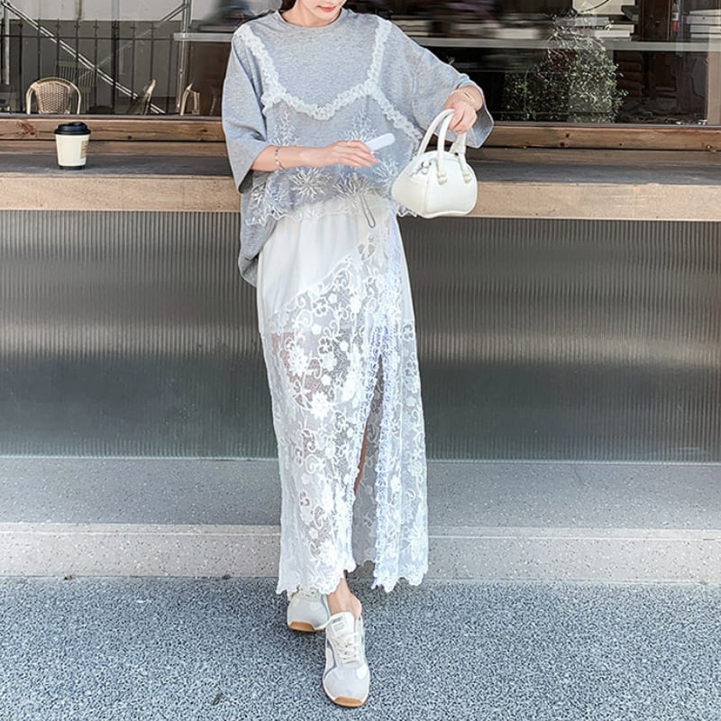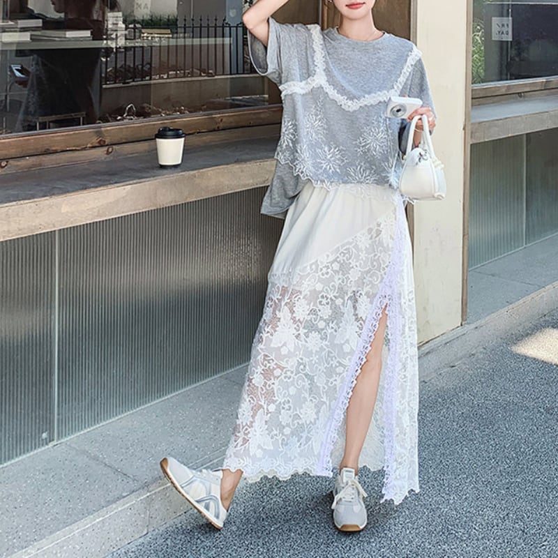 レースデザインTシャツ+レーススリットスカートセット 12380