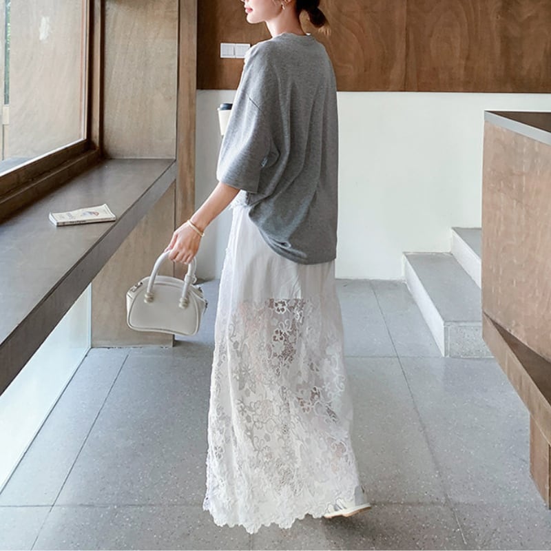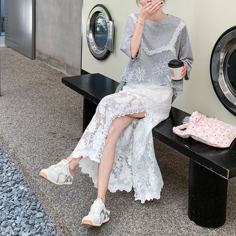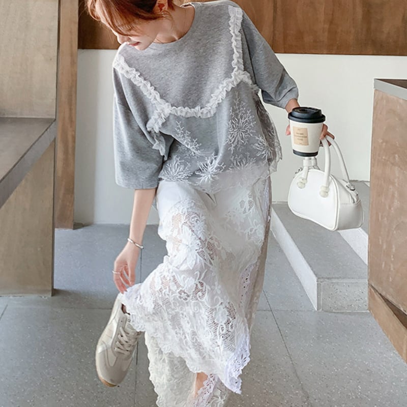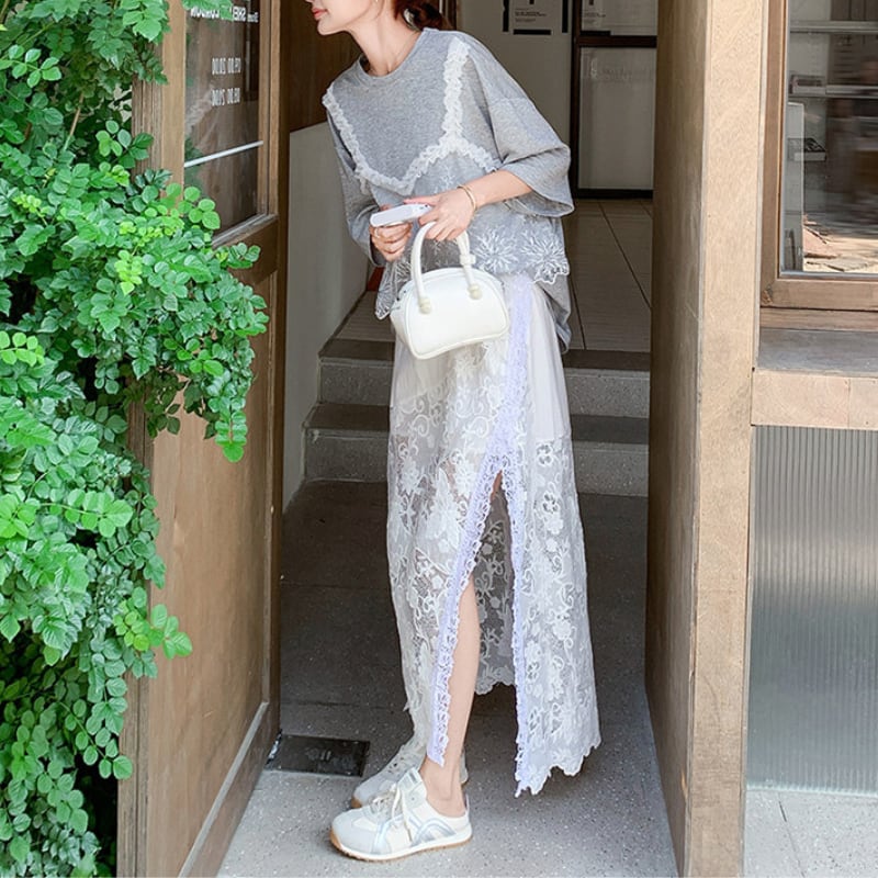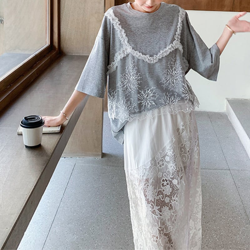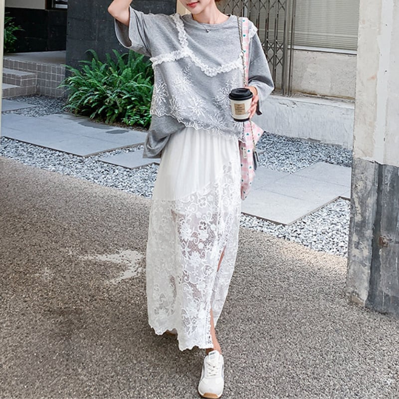レースデザインTシャツ+レーススリットスカートセット 12380