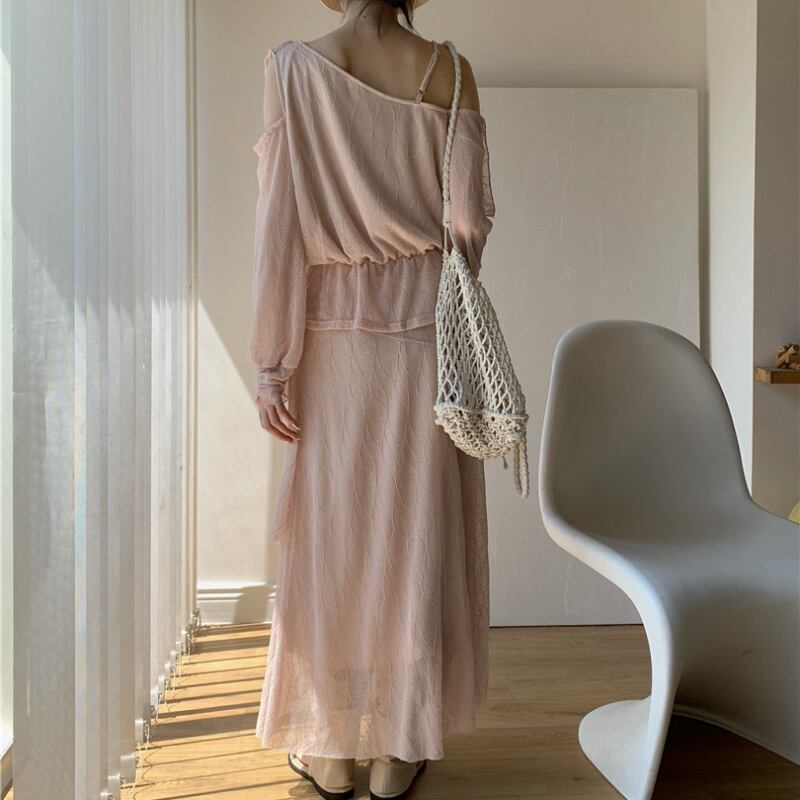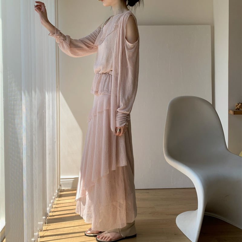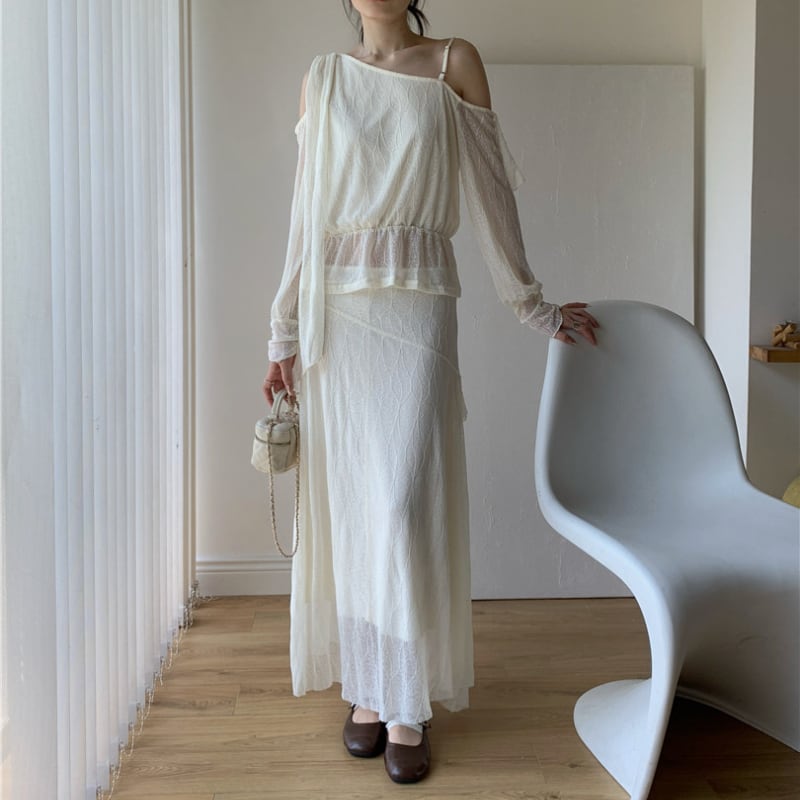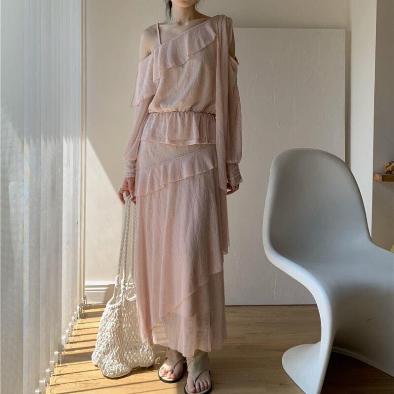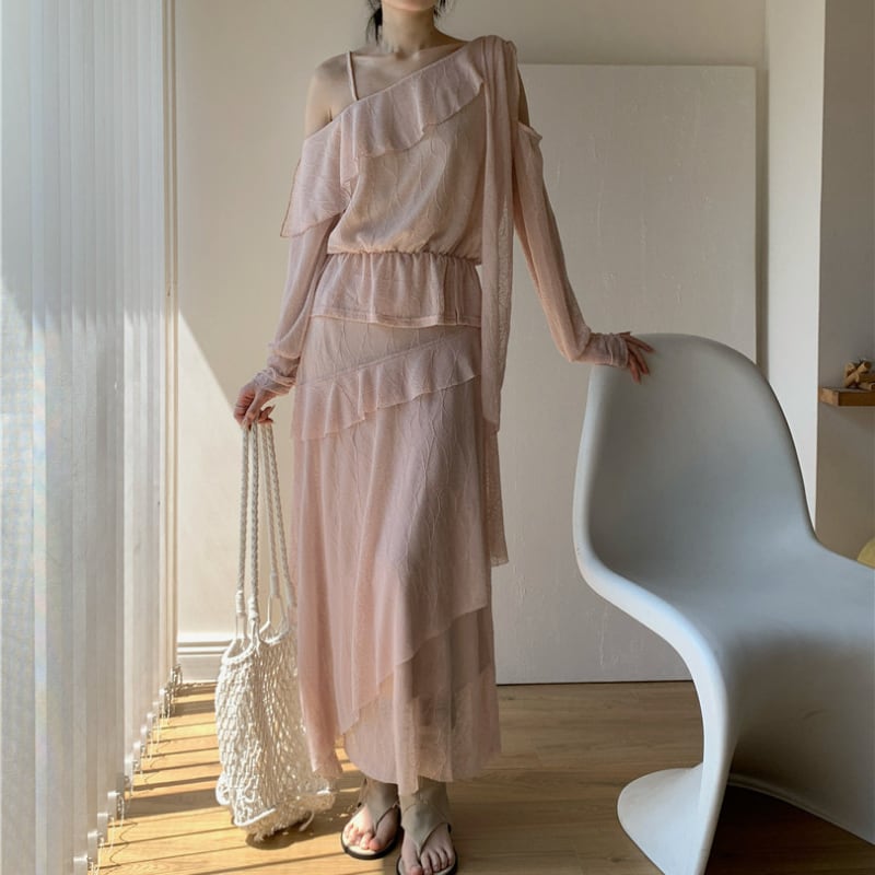 前後2wayフリルワンショルダートップス+スカート セット♢全2色 12382
