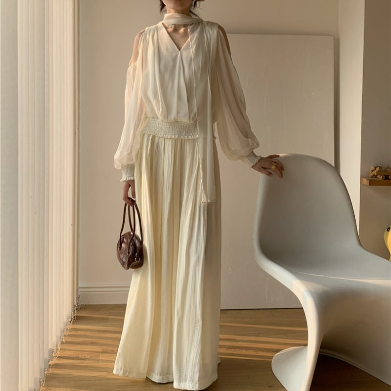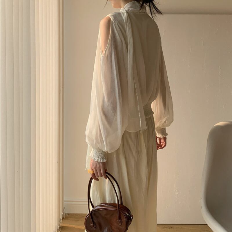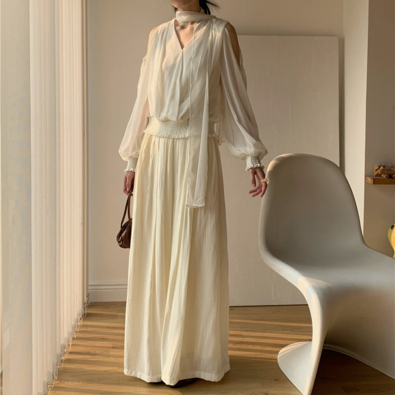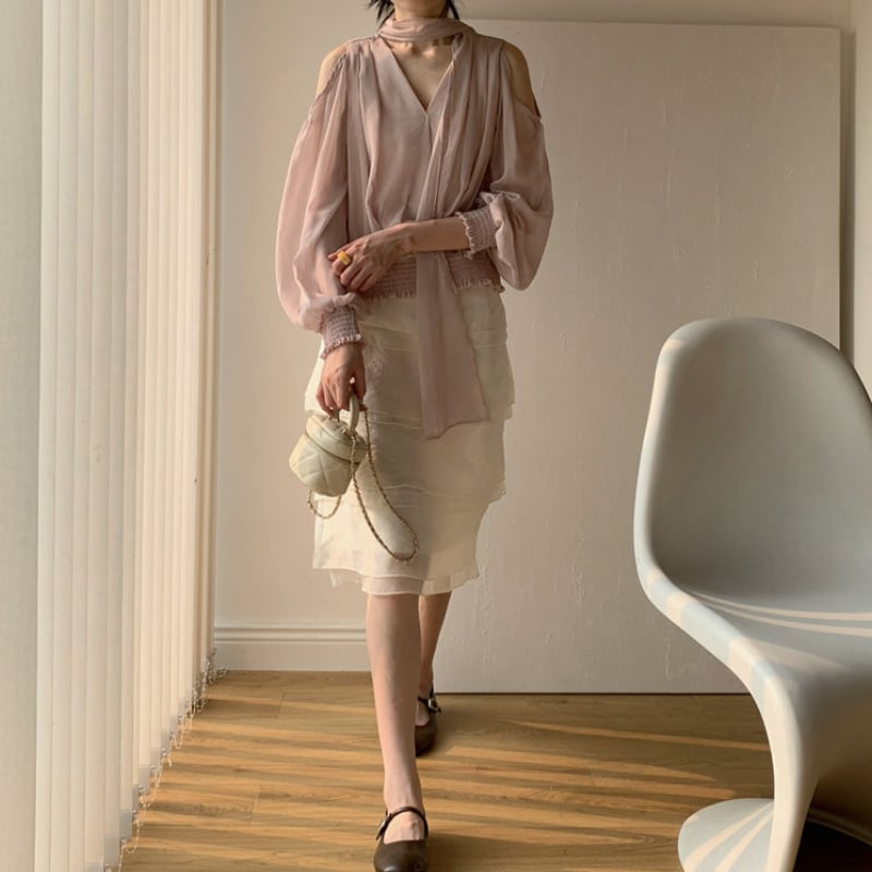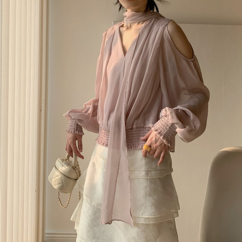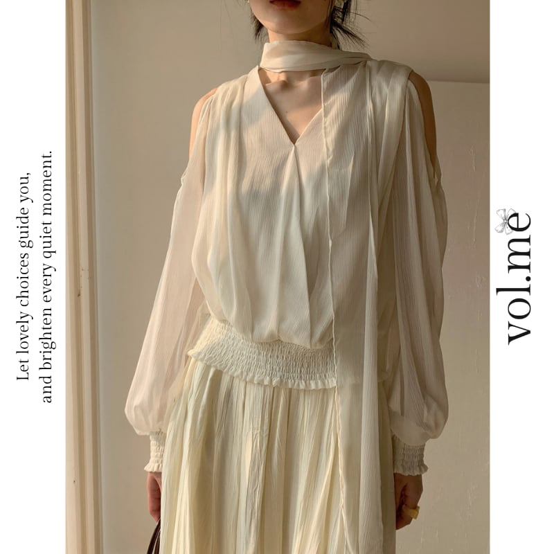 Vネックリボンオープンショルダーブラウス♢全2色 13025