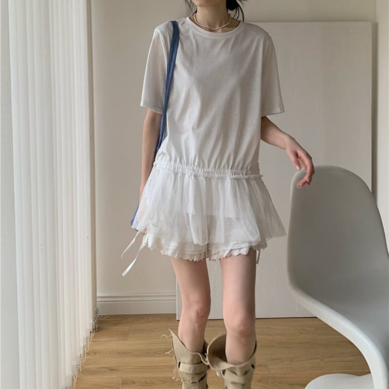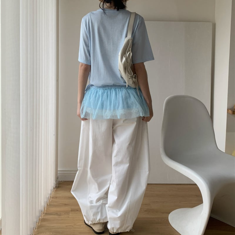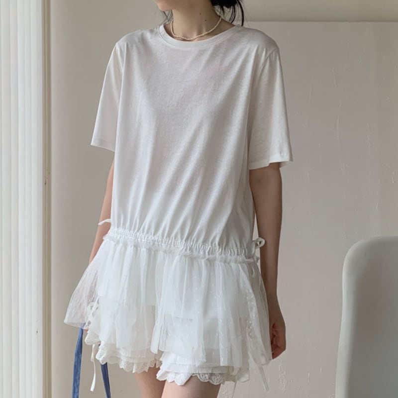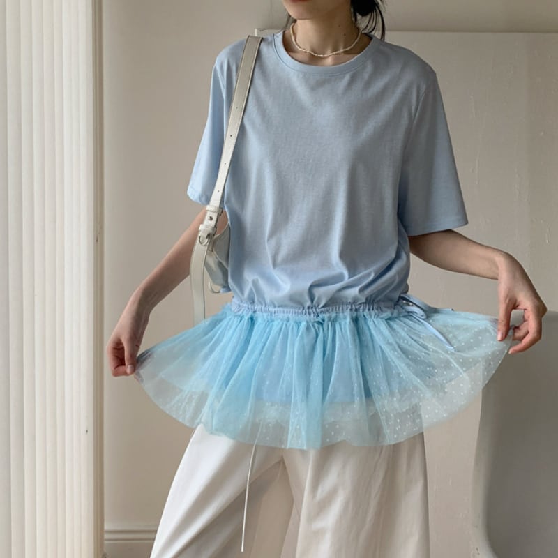シンプルなTシャツに、チュールを重ねることで華やかさを演出。