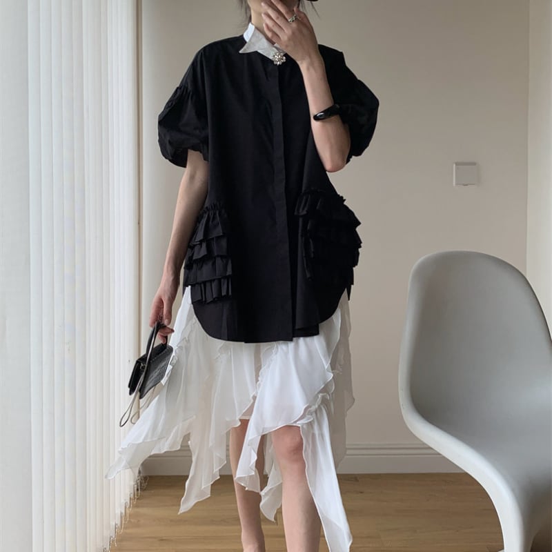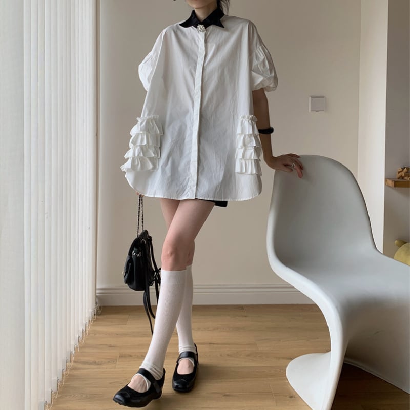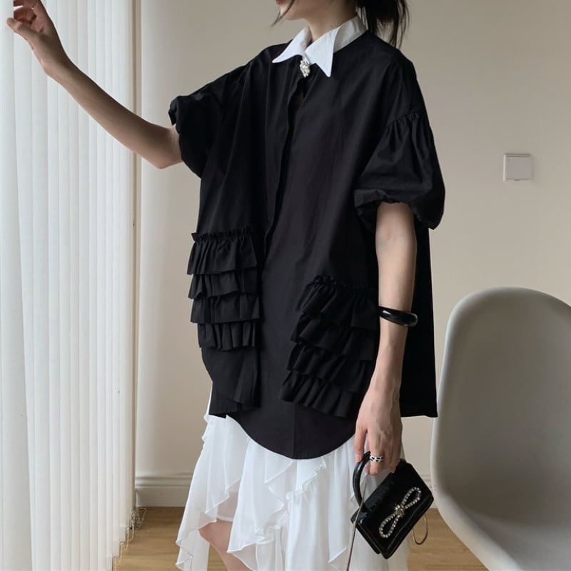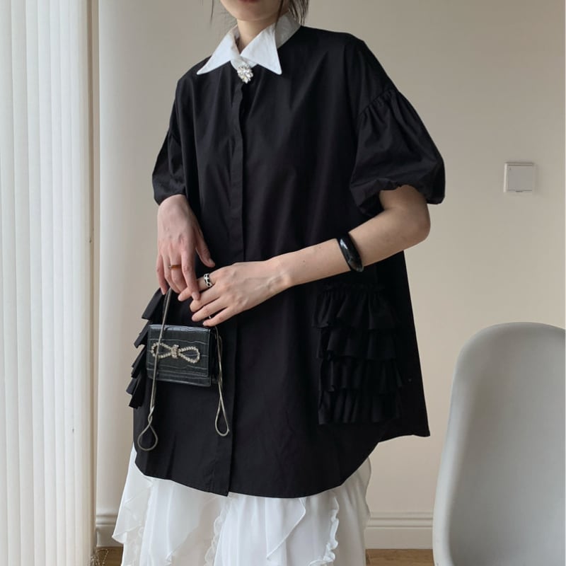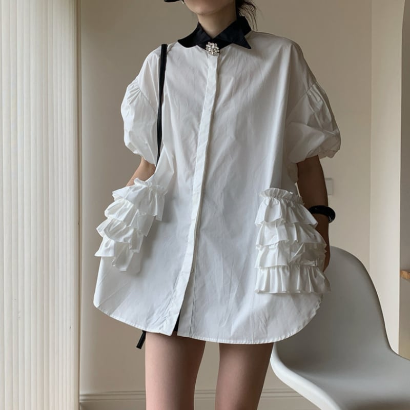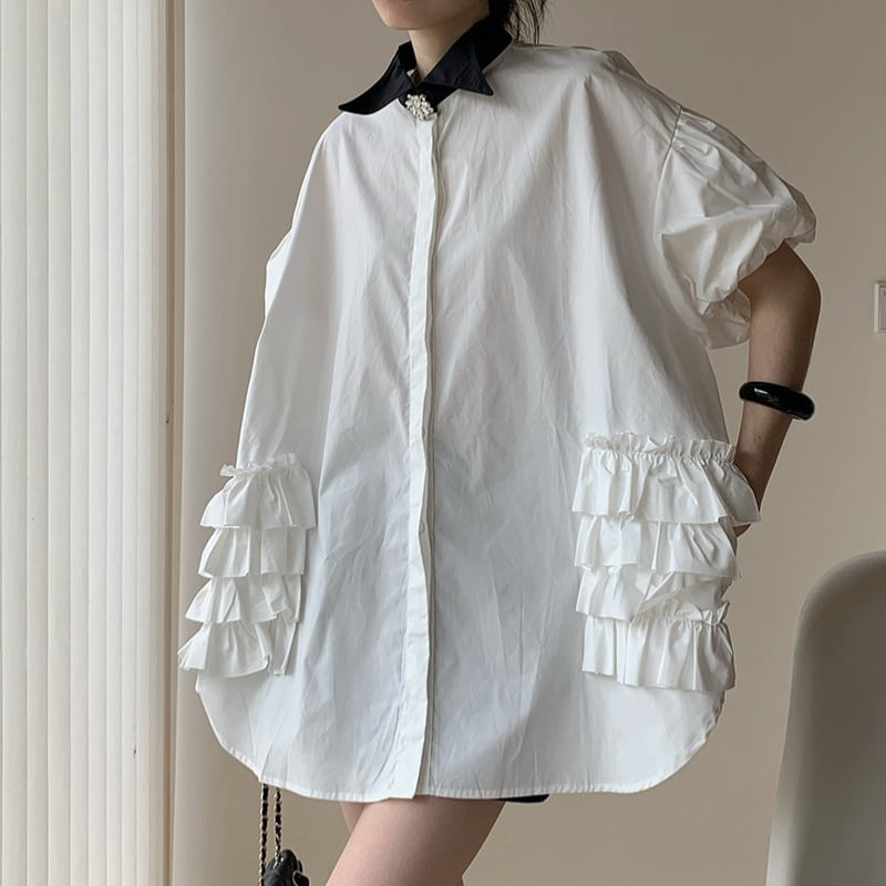 フリル付きヒップ丈オーバーサイズシャツ♢全2色 13030