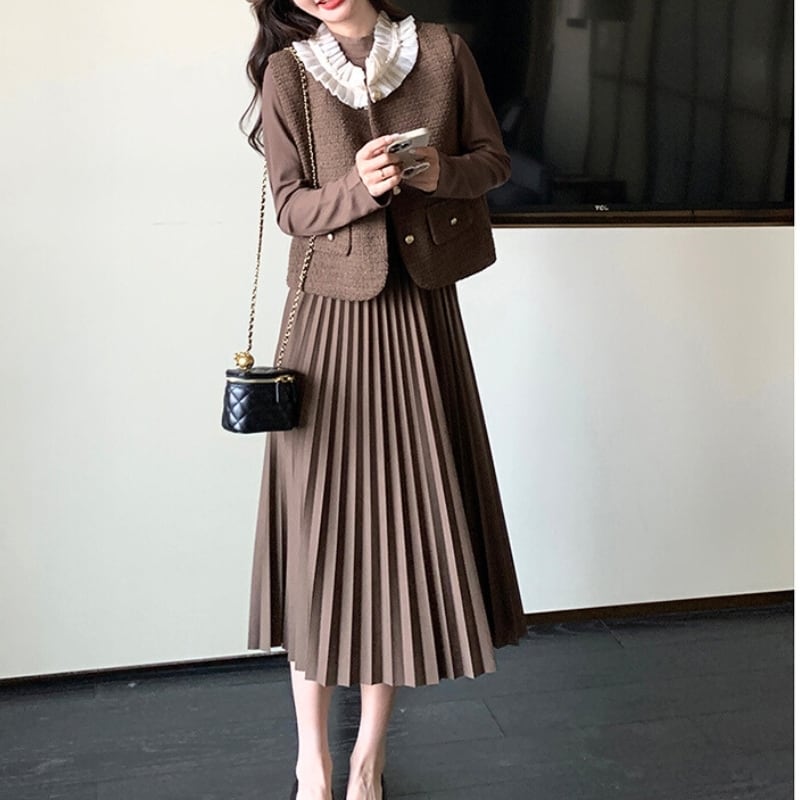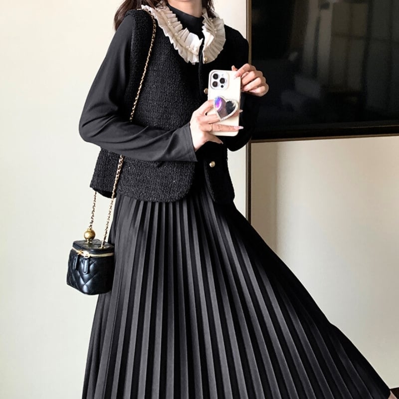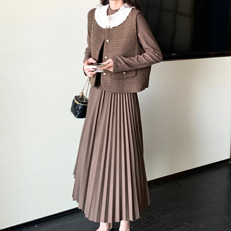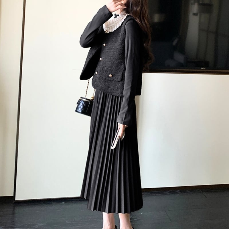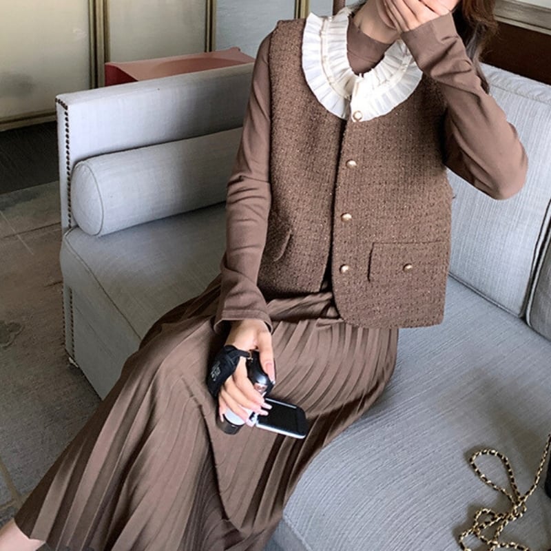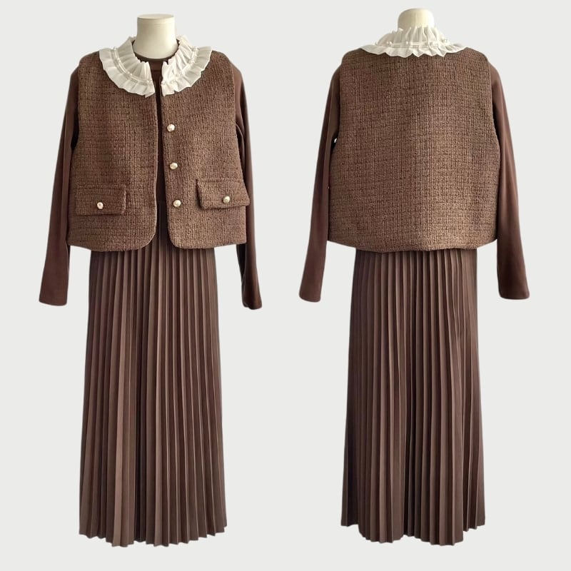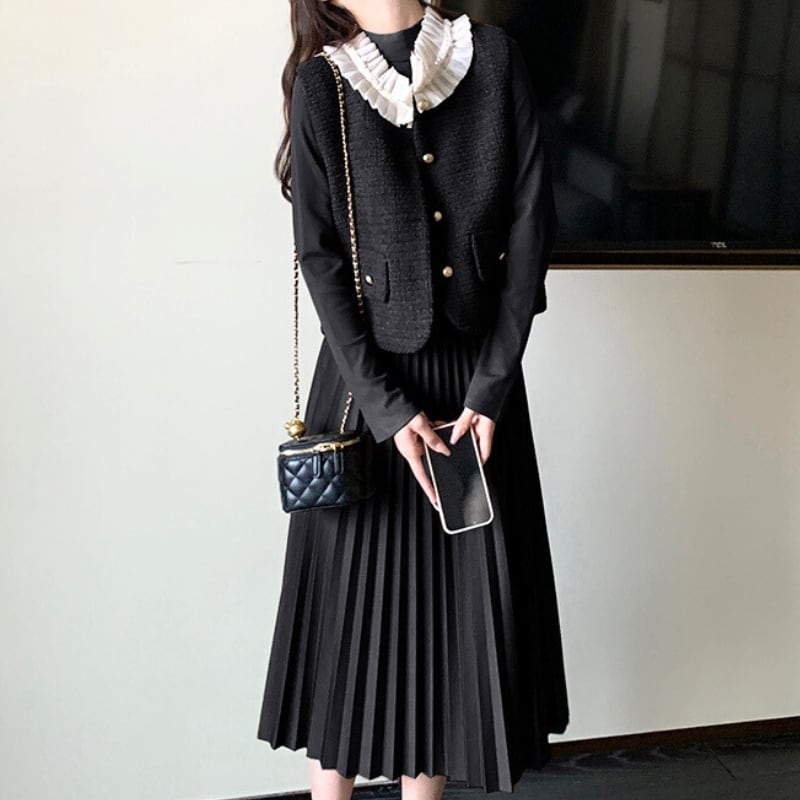 フリルカラーツィードベスト+ロングワンピース♢全2色 12143