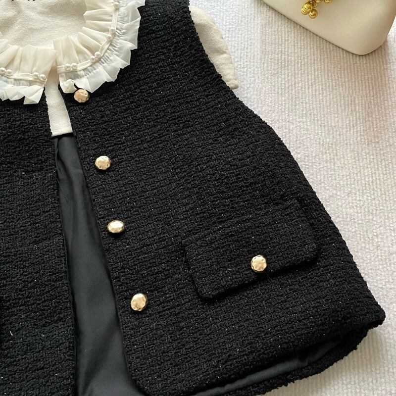 フリルカラーが素敵なツィードショート丈のベストと